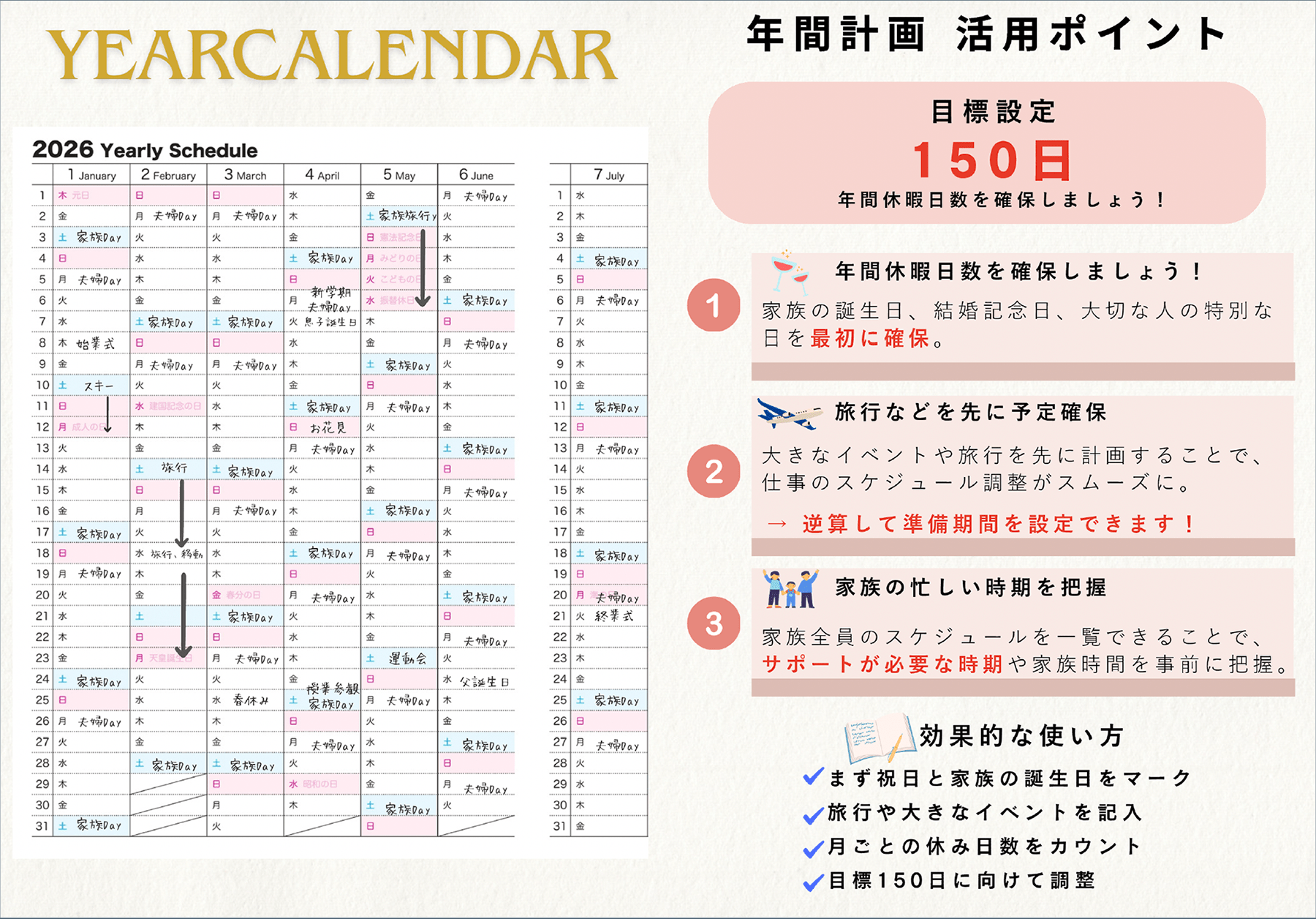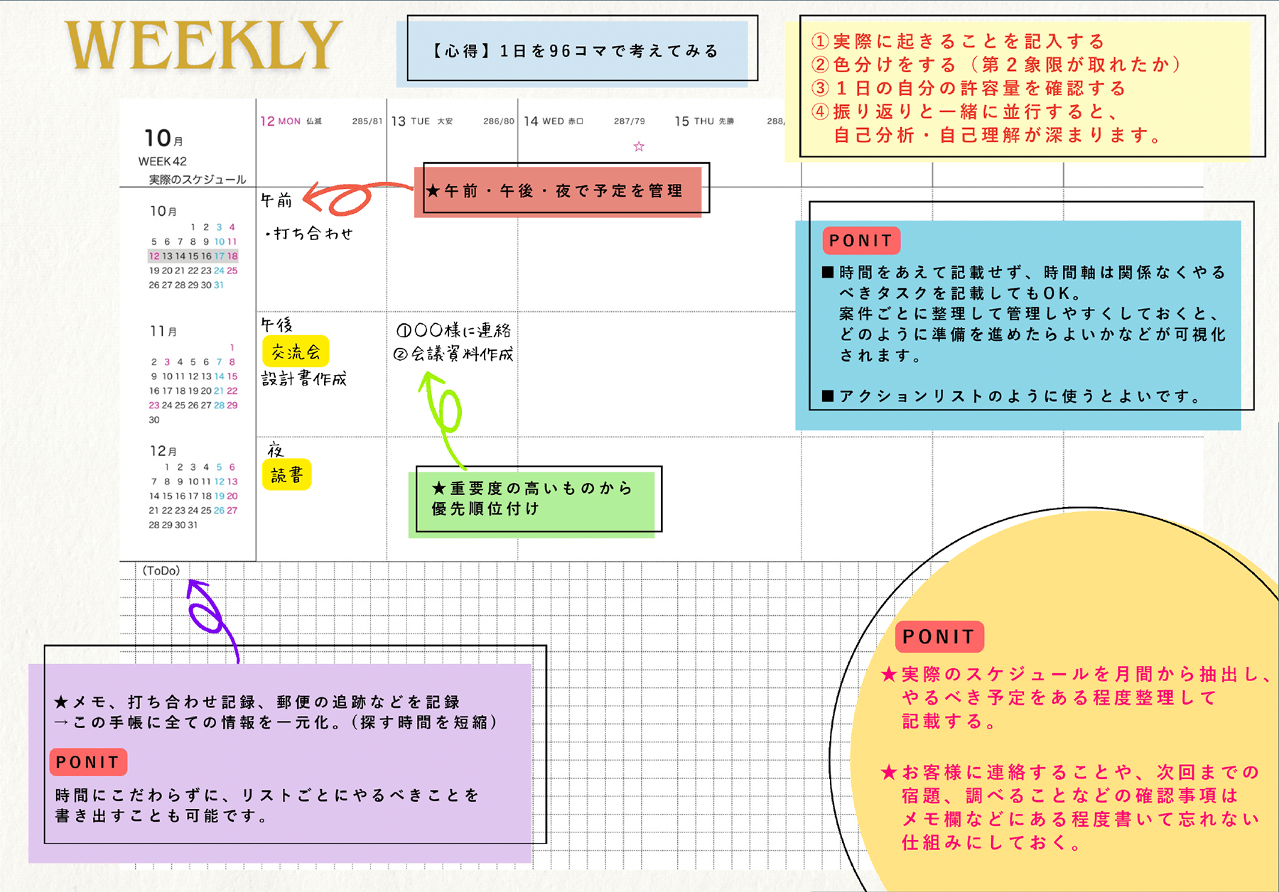 手帳に沿って記入すればPDCAが完結する独自設計