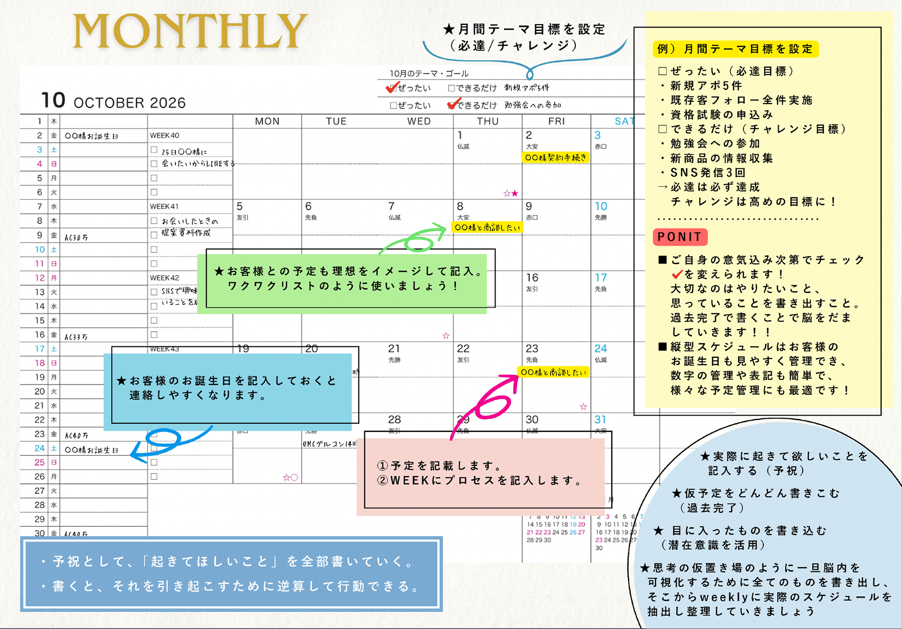 手帳に沿って記入すればPDCAが完結する独自設計
